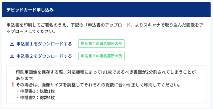 プロフィールの更新が完了すると右上にデビットカード申し込みリンクが表示されますので、そちらをクリックして下さい。
